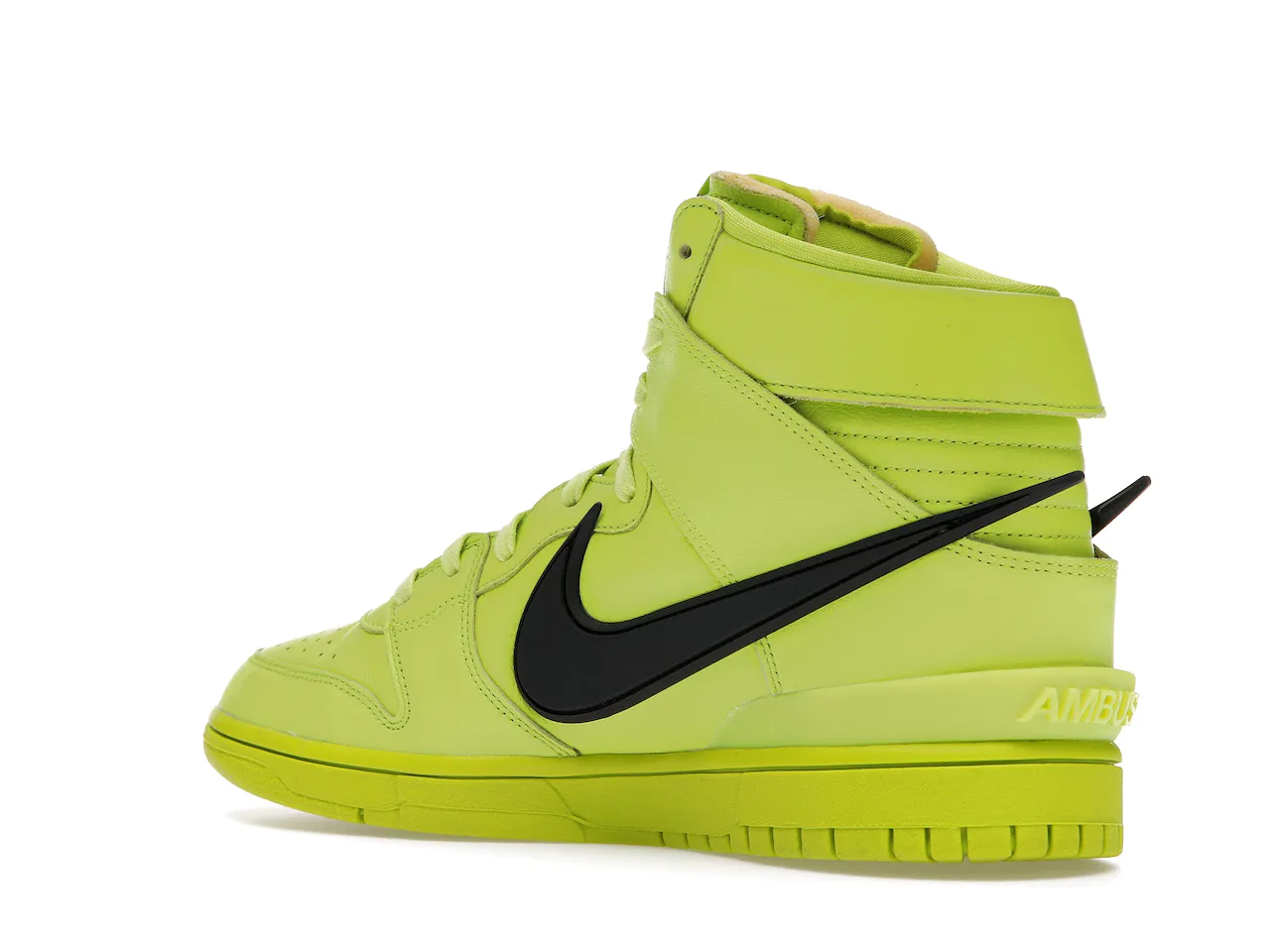 En un verde neón, los tenis Nike Dunk High x AMBUSH Flash Lime llegan con un bloqueo de color tonal similar al del colorway Active Fuchsia.Los Dunk High Ambush Flash Lime son una colaboración entre la marca de moda japonesa Ambush y Nike, lanzada en 2020. Se trata de una versión renovada de las clásicas zapatillas Dunk de Nike, con un diseño moderno y llamativo.Estas zapatillas están construidas con una parte superior de cuero suave de color verde lima, con un diseño sobresaliente en forma de Swoosh en relieve que se extiende hacia la suela. Además, tienen una lengua acolchada con el logotipo de Ambush en relieve y detalles reflectantes en la parte trasera de la zapatilla.Estos tenis están diseñados para ofrecer comodidad y durabilidad en la cancha de basquetbol, pero también son ideales para uso diario gracias a su estilo único y llamativo. Además, la colaboración con Ambush agrega un toque de moda y diseño de vanguardia que las hace destacar en el mercado de los tenis.“Este modelo es fiel a la talla. Te recomendamos elegir tu talla habitual”Color ATOMIC GREEN/FLASH LIME-BLACK